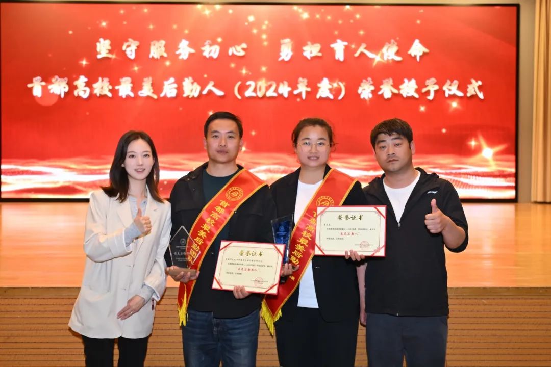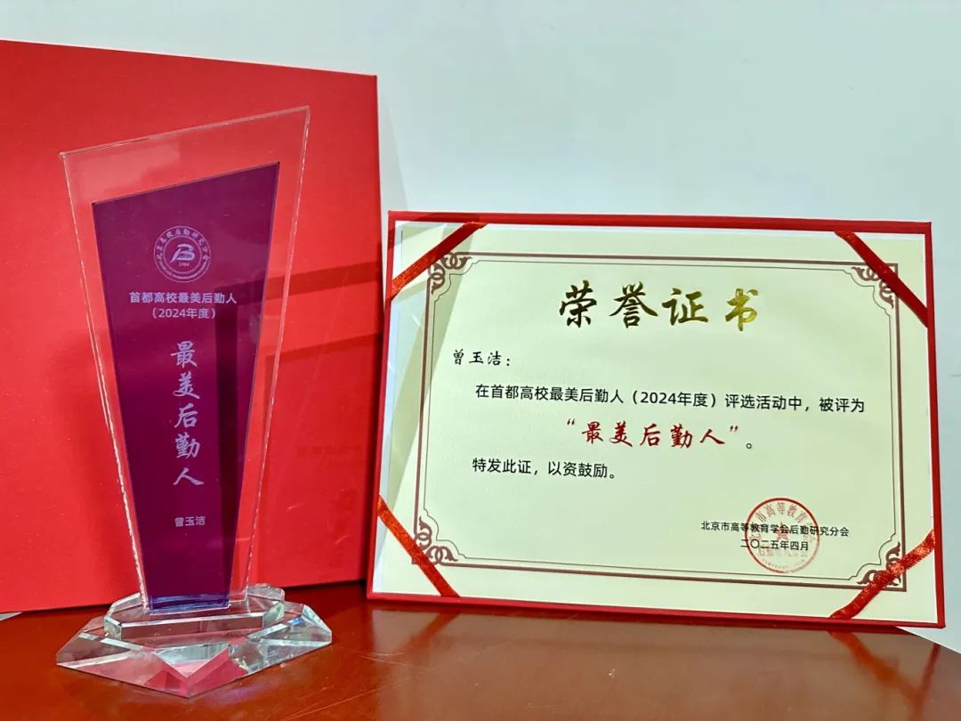 在北京市高等教育学会后勤研究分会举办的“坚守服务初心,勇担育人使命”为主题的“2024年度首都高校最美后勤人”评选活动中,经过材料审核、网络投票、专家评审等多环节评选,我校后勤处绿化保洁团队从75所高校的51支团队中脱颖而出,荣获“首都高校最美后勤团队”称号。后勤处公寓中心主管曾玉洁在102名个人候选者中突出重围,荣获“最美后勤人”称号。
